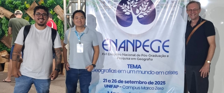 Os professores Vitor Koiti Miyazaki, Carlos Roberto Loboda, Tiaraju Salini Duarte e Josimar dos Reis Souza do Programa de Pós-Graduação em Geografia, participaram do XVI Encontro Nacional da Associação Nacional de Pós-Graduação e Pesquisa em Geografia (ENANPEGE), realizado em 2025, em Macapá (AP).